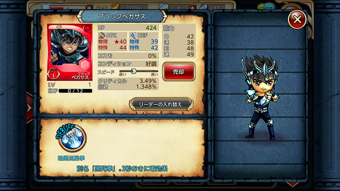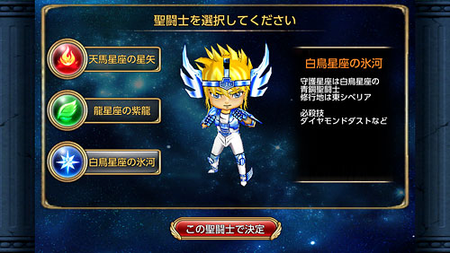 聖闘士星矢 すご技パーティバトル 聖闘士星矢 すご技パーティバトルジャンル:フル3DアクションRPG価格:ダウンロード無料/一部アイテム課金http://seiya-sgbt.jp***星矢の新しいアプリ、気付いたらiOS版も始まっていたのね。ってことで始めてみました。にしても、ロゴや聖衣の感じから原作基準のアプリなんだろうけど、絵柄や髪色がアニメ基準になってて、ごちゃ混ぜなのが何か新しいww 最初に聖闘士を選べと言われるので、モチロン氷河ちゃんで・・・でも、微妙に可愛く無い気が・・・ww ずっとカードバトルものばかりだったから、新しくてイイネ。アクションRPGって言っても操作はカンタン。オートで戦わせることも可能です。 ストーリーモード進めてたら、なんか拾いましたwwパーティは、リーダー+2名まで選べるようです。 ガチャで聖闘士を増やせるので、さらに仲間を増やそうと、黄金ガチャを引いてみたら、この結果よww 教皇ちょっとカッコイイなw 今度は白銀ガチャを引いてみる。星矢ちゃんの色違いが出ましたwブラックペガサスだけど、見た目が星矢ちゃんだから可愛いな。ちょっと暗黒聖闘士率高過ぎ!!…と思ったけど、ヤバイ、このブラックドラゴン、凄く可愛いかもwwこんな感じで、今は微妙なパーティになってますけど、お気に入りのパーティ組めるまで、ちょっと遊んでみようと思います。今の所、そんなにやり込む感じでも無さそうだし、これならモバ星の合間にやるのが丁度良いかも。でも、そろそろソシャゲの時間減らして、家庭用ゲーム機で遊びたいんですけどね(苦笑 [1回]PR