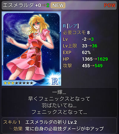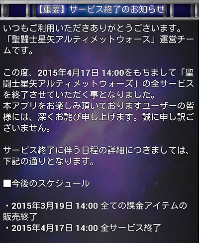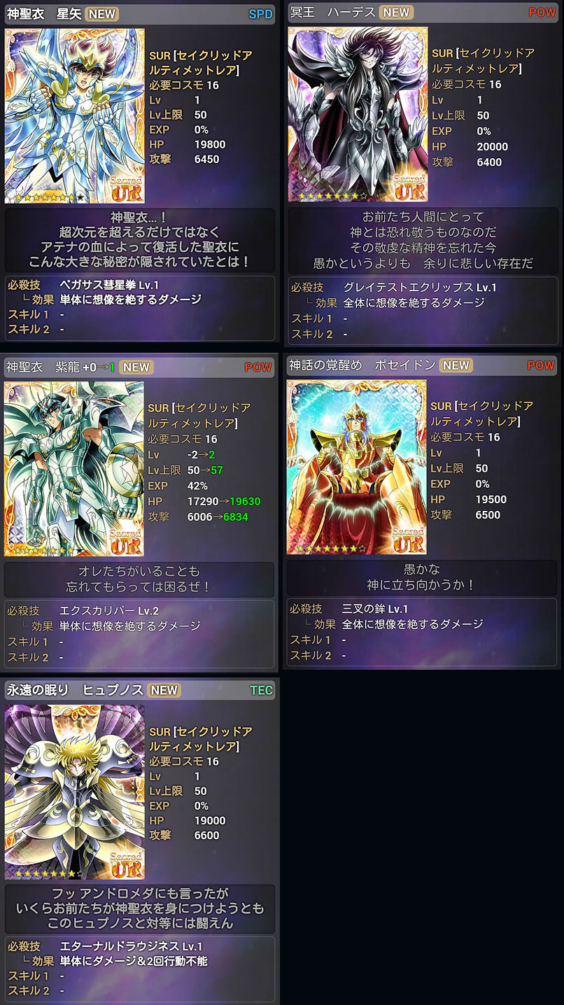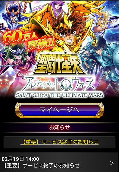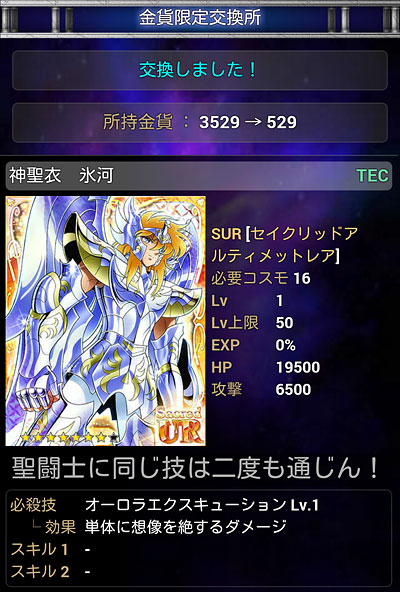 聖闘士星矢 アルティメットウォーズ(24) GREE 聖闘士星矢 アルティメットウォーズ 終了のお知らせ(涙) 先日、グリ星が終わると聞いて久々にINしてみたらホントだった・・・モバ星(もうすぐ3年目)はまだ続いてるのに・・・グリ星の方が後から始まったのに・・・丸2年で終了かぁ・・・モバ星メインになる前は、グリ星メインだったから、ずっと放置しといて何ですが、いざ終わるとなるとやっぱ寂しいっすわ・・・モバ星と違って、無課金に優しい仕様だったからなぁ。と、言いつつSURが出始めた頃から付いていけなくなりましたけどw原作カラーや天界篇カードまで出して差別化計ってたので、無くなってしまうのはホントに残念です。モバ星は、最近ネタ切れかもしれんが(爆)もう少し頑張ってくれよ・・・春から新アニメだって始動するんだからサ。今年も星矢コンテンツ盛り上げていこうゼ。マジ。 金貨交換所に欲しかった神聖衣・氷河さんが居たので、交換しておきましたw金貨残しておいても仕方ないのでね・・・グリ星メインでやっていた頃はガラケーだったので、大きな画像で拝めて良かったですwあと、グリ星は配信終了までガチャチケが沢山貰えるイベントをやっております。今のうちにカード収集しとけってことですかね。ってことで久々に遊んでみたんだが、ちょっとガチャやっただけで、SURが出るわ出るわ・・・ww こんなシーンまで、カードにしていたんですね・・・(^^;) [0回]PR
