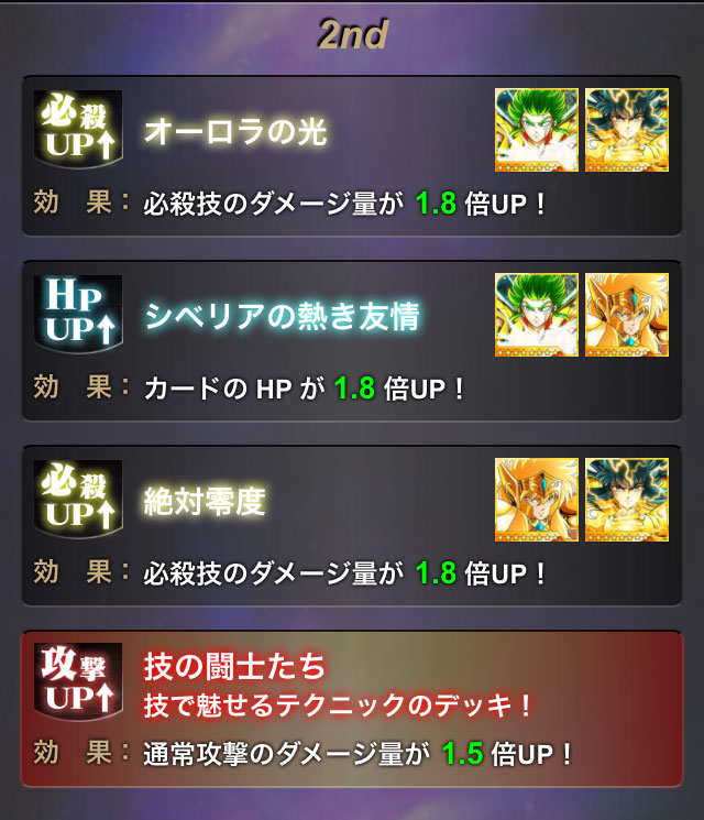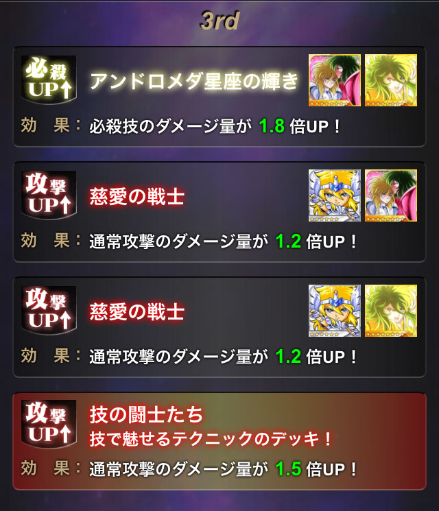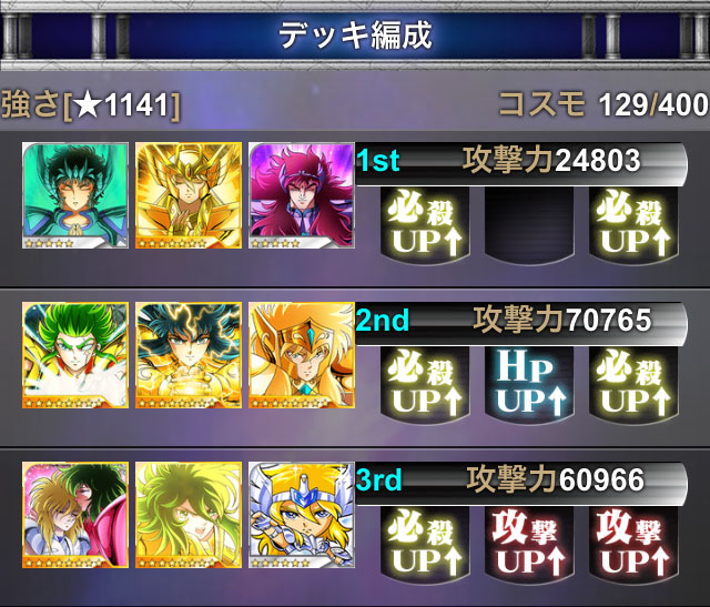 【GREE】聖闘士星矢 アルティメットウォーズ(18) \ み じ ゅ は iPod touch を 手 に 入 れ た ! /ということで(笑)、外ではガラケーのままですが、家の中では、グリーもモバゲーもスマホ版で遊びますよ〜^^てか、スマホ版でプレイしてみてビックリ。想像以上に快適だったwwバトル画面がまともに見れるようになっただけでなく、何もかもがサクサク動く♪やはり私のガラケーは古過ぎたみたいだ(苦笑ただ、文字打ちは、ガラケーの方が楽だなぁ。フリック入力を早くマスターしないと駄目だね。満足にコメ出来ないわ。orz***スクショが撮れるようになったので、デッキ公開しちゃいます。一列目は特攻カード用にしてるので、イベ毎に変わります。今はシャカと弟子2名が特攻になってるので、それを入れてるだけっす。特攻カードが無い時は、手持ちの中で強いカードを投入。よく入れてるのは、このお方かな。 なんか、必殺技的に技レベル上げ易くて、今レベル5くらい。コンボも発生させやすくて、結構活用してます。二列目・三列目は、ほぼこれで固定です。SD氷河はリダカにしてるので、強制的に入ってるだけですがwまぁ、変えたとしても、やっぱ氷河カードになると思うので結果あまり変わらないかとwwSRも含めれば、氷河カードが増えてきたので、いつの日か氷河オンリーデッキ組んでみたいw弟子同士のコンボが発生しないんですがw 何故?お前ら、アニメで一緒に一輝と戦ってなかったっけ?シベリア師弟を見習った方が良いと思うよw 優秀なシベリア師弟。先日コンボの見直しが入って、同じタイプ同士で組むと、さらにコンボが発生するようになりました。モバ星では、パワータイプのアイザックですが、こちらではテクニック系。運営GJでござる。気付けば、こちらもテクニック系。個人的には、必殺技は発動に左右されるので、攻撃力UPのコンボが一番使えるような気がします。てな感じで、日々グリ星を遊んでいるのですが、なんか1周年を迎えて、本格的に集金に走り出した感があるぞ、最近のグリ星。ヾ(;´▽`A``まぁ利益出さないと、商売にならないのはわかるのですが・・・ね・・・ [0回]PR
