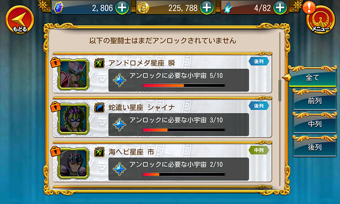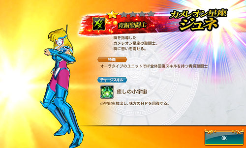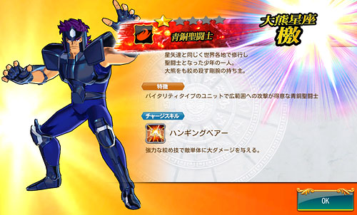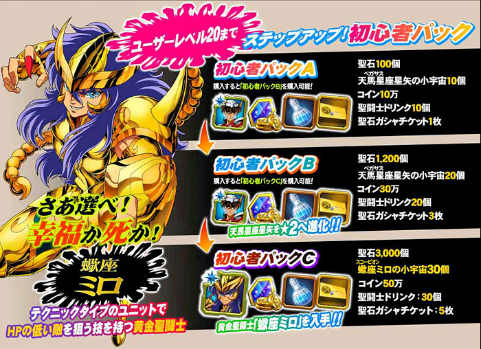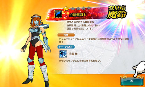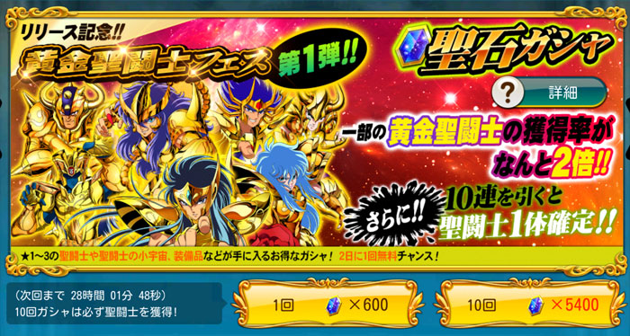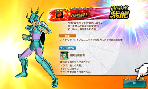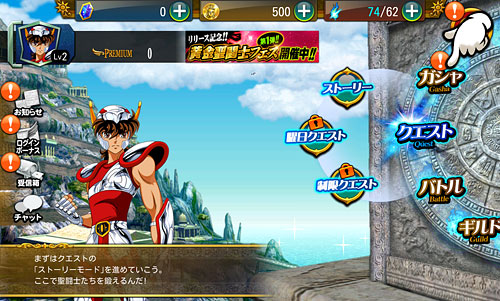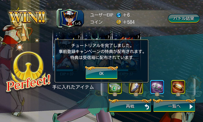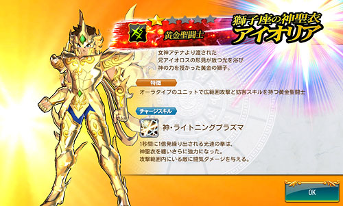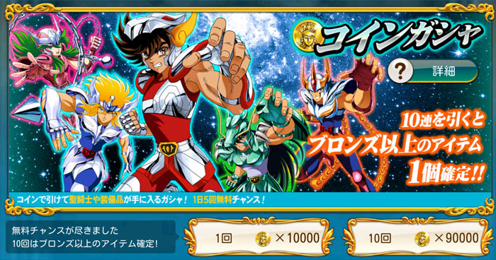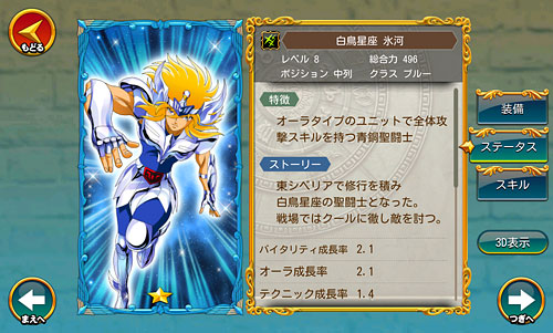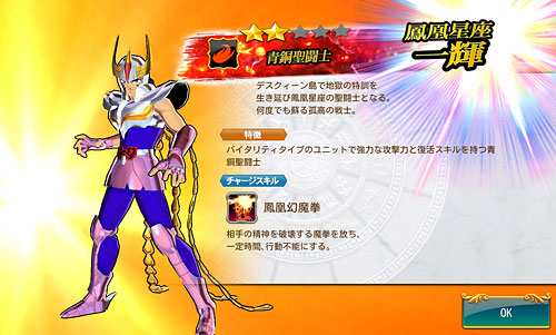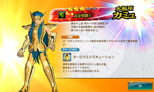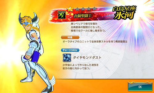 聖闘士星矢 ゾディアック ブレイブ ついに配信スタート!星矢の新アプリ・ゾディアック ブレイブ!(※Android版配信中。iOS版は近日配信予定)http://seiya-sp.bn-ent.netジャンルがアクションRPGってことで、パッとやってみた感じ「すご技パーティバトル」のバンナム版って感じ。ボイスが付いてるし、絵もキレイだし、クオリティは良いですね。ちなみにボイスはOVA基準。バンナム製(開発はセガ)なので家庭用ゲームからの流用ボイスが多いですが、よく喋りますよ♪最初のうちは出来る事が限られていますが、ユーザーレベルが上がっていくと、バトルや曜日クエストなど、出来る事が増えていきます。チャット機能もあるし、まだ解放されてないけど『ギルド』もあります。 起動後は色々DLした後(Wi-Fi環境推薦)、自動的に話が進んでいき、そのままチュートリアル開始。 最初のガチャはチュートリアルなので、紫龍と魔鈴さん固定みたいです。 通常クエストは、原作基準のストーリーになっているようです。キャラはアニメ版なのに(笑しかも使用キャラの組み合わせが、有り得ないことになってるけど(笑原作のストーリーを好きなキャラで挑めるのが、このアプリの面白いところなのかも。原作の忠実な追体験なんて、家庭用ゲームで散々やってきたしね。 クエストを2章終了まで進めるとチュートリアル完了です。これで、事前登録キャンペーンのプレゼントが貰えます。 【事前登録キャンペーン特典】・事前登録特典1 獅子座のアイオリア(神聖衣):1体・事前登録特典2 天馬星座の星矢(OCE):1体・事前登録特典3 聖石:5,400個【事前登録者数12万人突破記念特典】・特典1 聖闘士ドリンク:10個・特典2 コイン:100,000コインちなみに特典ですが、事前登録者全員が貰えるのではなく、「期間内にアプリをインストールして2章まで遊んだ人」が貰えるようです。期間はまだ決まってない様ですが、始めるなら早い方が良いと思います。 使える聖闘士たちはアンロック式になっていて、報酬やガチャで手に入れた「小宇宙」を規定のポイントまで溜めることで、解除=使用可能となります。そして解除後も、さらに「小宇宙」を集めることでレアリティを上げることが出来ます。 ストーリー進めてるうちに氷河さんも無事ゲット♪キャラにはレベルの概念がありますが、それ以外にも、報酬やガチャで手に入れた装備品やコインを使って、キャラを強化していきます。アクションRPGとなっていますが、戦闘はほぼオートだし、どちらかというとキャラ育成がメインになってくるみたい。ってことで、氷河さんを最強にしたい(笑 こちらはコインガチャ。主に装備品ばかり出るガチャです。ゲーム内で集めたコインを消費してまわすのですが、1日5回だけ無料分があります。コインは聖闘士の強化などで、結構消費するのでガチャでは消費せず、無料分だけ・・・ そして、こちらは聖石ガチャ。2日に1回無料分あり。事前登録キャンペーン特典で貰った聖石を使って、早速10連引いてみたら・・・ 我が師キターーーー!(((o(*゚▽゚*)o))) 早速、氷河さんと一緒に使ってみた♪シベリア師弟、夢の共闘!こういうことが出来るのもゲームならでは♪闘技場でバトルしてランキングの自己記録を更新すると、そこでも聖石が貰えるので、更にもう1回10連ガチャをやってみました。 兄さんキターーーー!しかも★2だ♪(((o(*゚▽゚*)o))) 激か・・・出番なさそう。あとは、カニや瞬ちゃんの小宇宙が少し溜まったくらいです。 あ、あとジュネさんも居るんですが、全体回復の技を持ってるので重宝しています♪優先的にスキルLvを上げてあげると有利に戦えると思います。あとボイスもちゃんと付いてます(てかサブ含め基本的に全員付いてる)それならソルソルでも出てくれれば良かったのに。貴重な女子キャラなだけに・・・ 他には、初心者パックの販売や・・・(ミロ様で吊るなんて卑怯や!w プレミアムランクを上げないと引けない先行配信のガチャもあります。プレミアムランクを手っ取り早く上げるには・・・要課金ですな(苦笑ただ、初日から緊急メンテやったりしてて不安定な部分もあるので、今のところ課金はしてません。まだ最初だから簡単にレベル上がるし、今は地道にコツコツといきたいと思います。てか、氷河さんとカミュが揃ったから満足。あとは育てるだけ(笑 [0回]PR